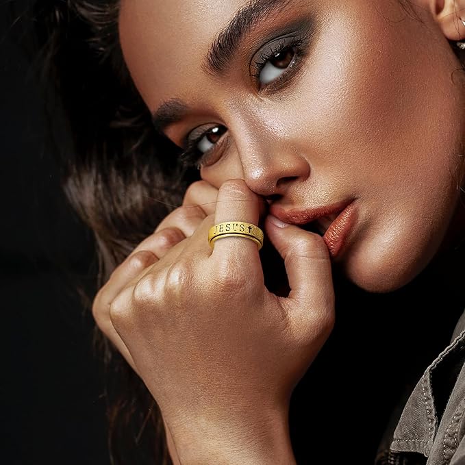 - These Jesus spinner rings are made of stainless steel,hand polished surface, sand blast finished, hollowed the words, deepth:6mm(15/64"), gold silver available now,and rose gold black rainbow color will in stock soon
