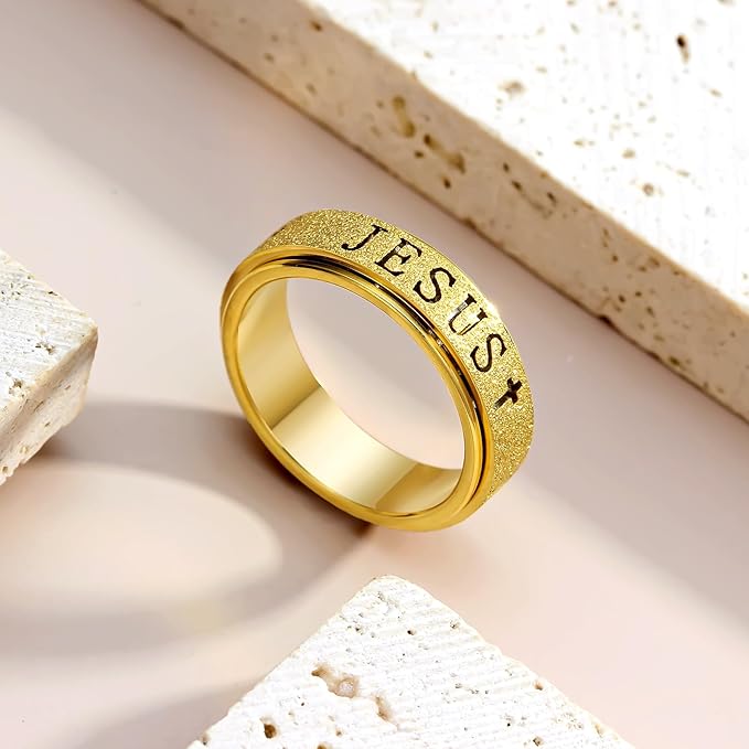 - These Jesus spinner rings are made of stainless steel,hand polished surface, sand blast finished, hollowed the words, deepth:6mm(15/64"), gold silver available now,and rose gold black rainbow color will in stock soon