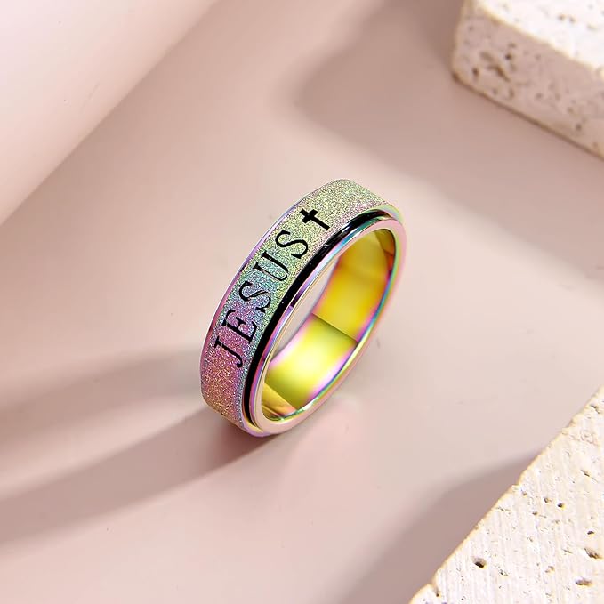 - These Jesus spinner rings are made of stainless steel,hand polished surface, sand blast finished, hollowed the words, deepth:6mm(15/64"), gold silver available now,and rose gold black rainbow color will in stock soon