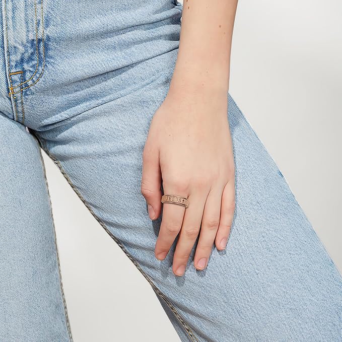 - These Jesus spinner rings are made of stainless steel,hand polished surface, sand blast finished, hollowed the words, deepth:6mm(15/64"), gold silver available now,and rose gold black rainbow color will in stock soon